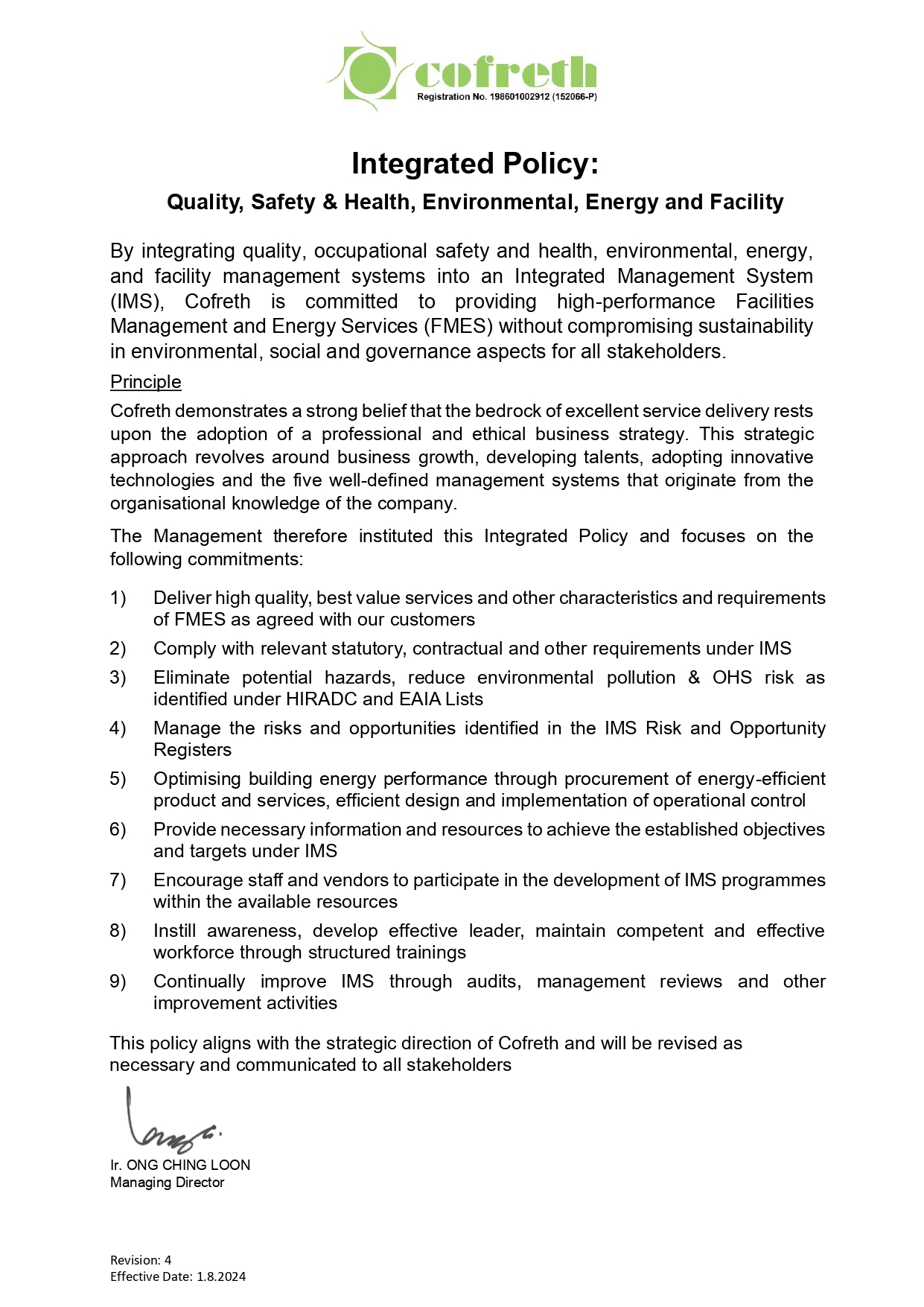 Integrating quality, health, safety, environment and facility management systems into an Integrated Management System (IMS) , Cofreth commits to provide high performance Facilities Management and Energy Services (FMES) without compromising safety & health of all stakeholders yet upholding environment sustainability